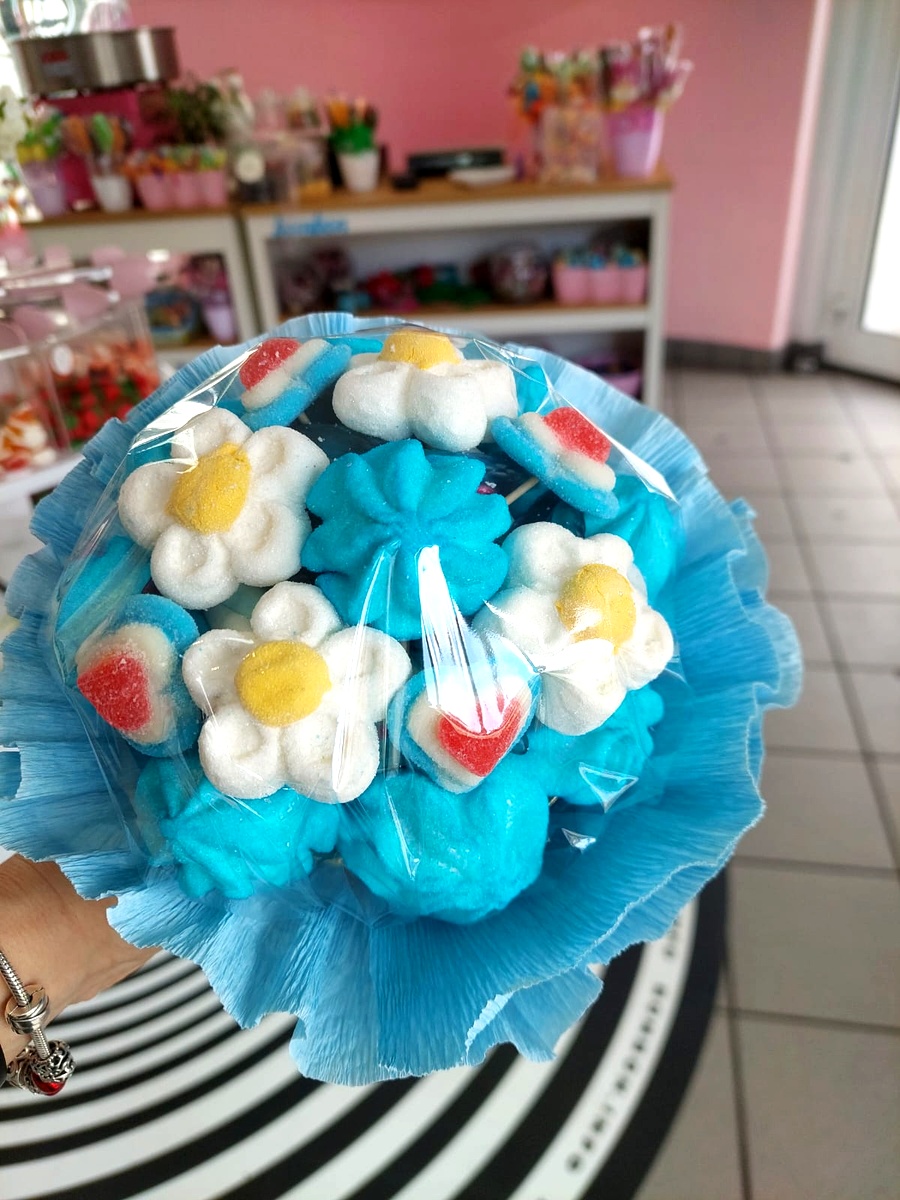 Bukiet składa się z piankowych kwiatków na patyku, zapakowany w niebieski papier falisty i przezroczystą folię. Przeważają kolory biały i niebieski. Każdy bukiet to unikalna kompozycja stworzona z ręcznie robionych lizaków i karmelków.