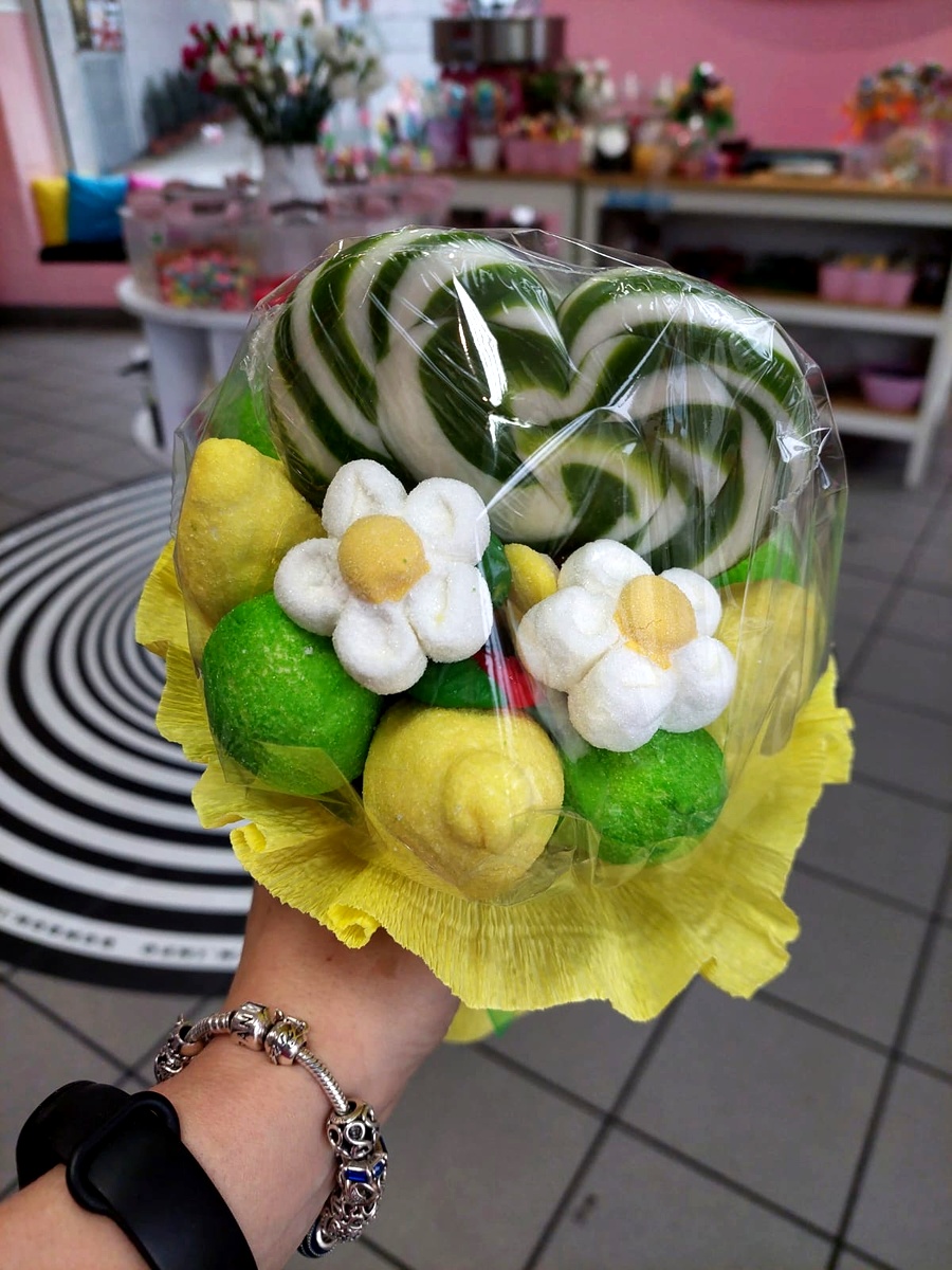 Bukiet składa się z dwóch lizaków w biało-zielone paski, piankowych kwiatków i cukierków w kształcie cytryn i limonek. Całość jest owinięta żółtym papierem i folią. Każdy bukiet to unikalna kompozycja stworzona z ręcznie robionych lizaków i karmelków.