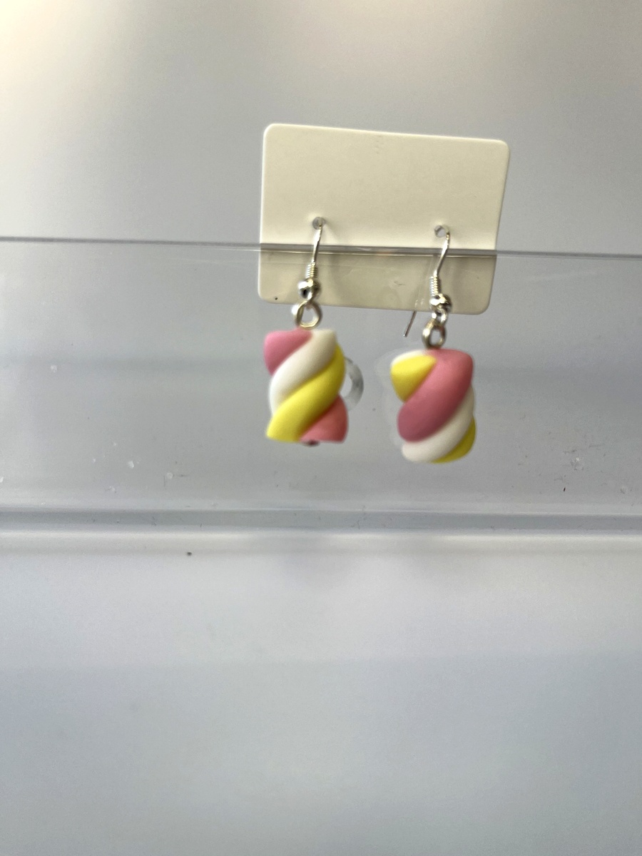 Urocze kolczyki imitujące skręcone pianki w pastelowych kolorach.