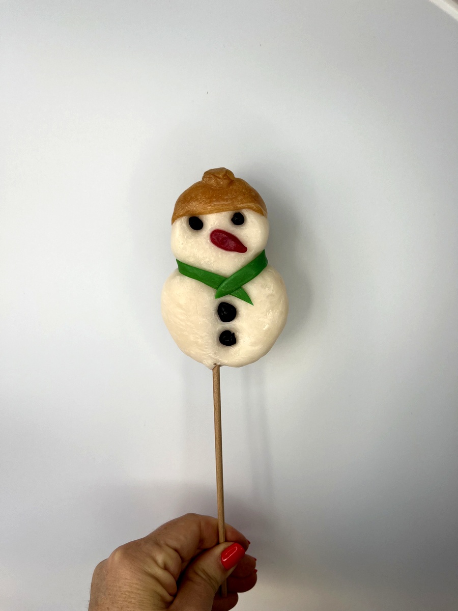 Uroczy lizak w kształcie bałwanka z białym korpusem, brązową czapką, zielonym szalikiem, czerwonym noskiem oraz czarnymi oczami i guzikami. Każdy lizak to unikowe dzieło sztuki cukierniczej, tworzone tradycyjnymi metodami rzemieślniczymi.