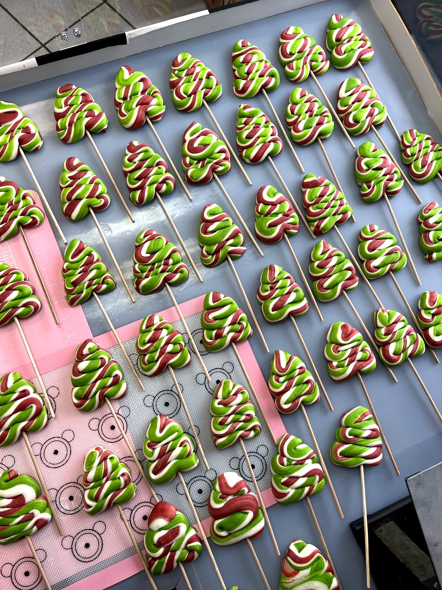 Lizaki w kształcie choinki, wykonane z misternie skręconych warstw karmelu. Dominują żywe kolory zieleni, czerwieni i bieli, tworząc efektowne, świąteczne paski. Każdy lizak to unikowe dzieło sztuki cukierniczej, tworzone tradycyjnymi metodami rzemieślniczymi.