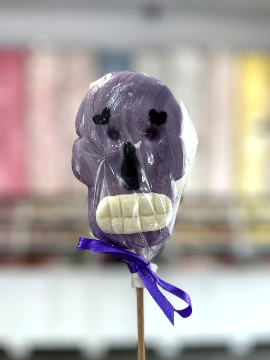 Fioletowy lizak w kształcie czaszki z charakterystycznymi czarnymi oczodołami i nosem oraz białymi, wyraźnie zaznaczonymi zębami. Jest zapakowany w przezroczystą folię i ozdobiony fioletową wstążką. Każdy lizak to unikowe dzieło sztuki cukierniczej, tworzone tradycyjnymi metodami rzemieślniczymi.