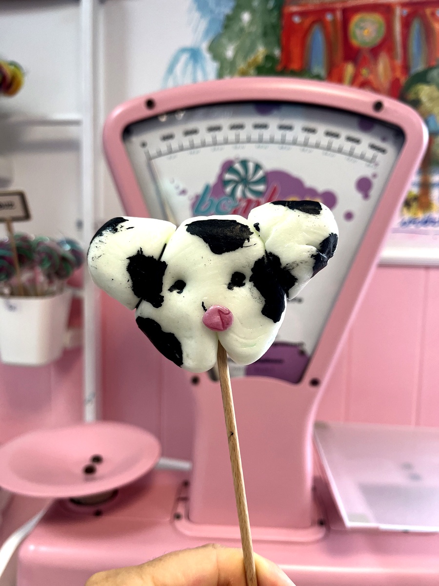 Lizak ma kształt zwierzęcia, przypominającego krowę z czarnymi łatami na białym tle. Posiada mały, różowy element imitujący nos. Każdy produkt to unikalne dzieło sztuki cukierniczej, tworzone tradycyjnymi metodami rzemieślniczymi.