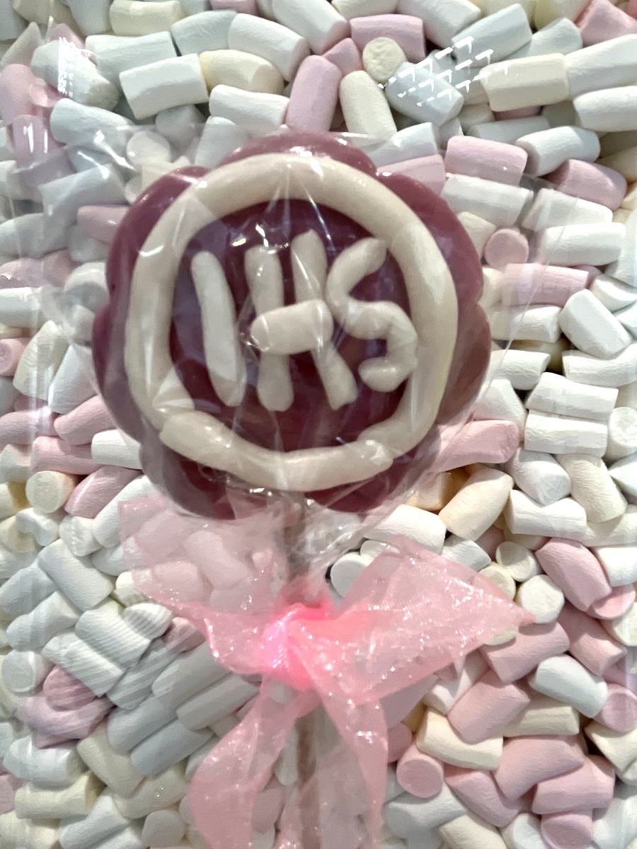 Lizak w kształcie kwiatka, z umieszczonymi w środku literami „IHS”. Otoczony jest dekoracyjną wstążką. Każdy lizak to unikalne dzieło sztuki cukierniczej, tworzone tradycyjnymi metodami rzemieślniczymi.