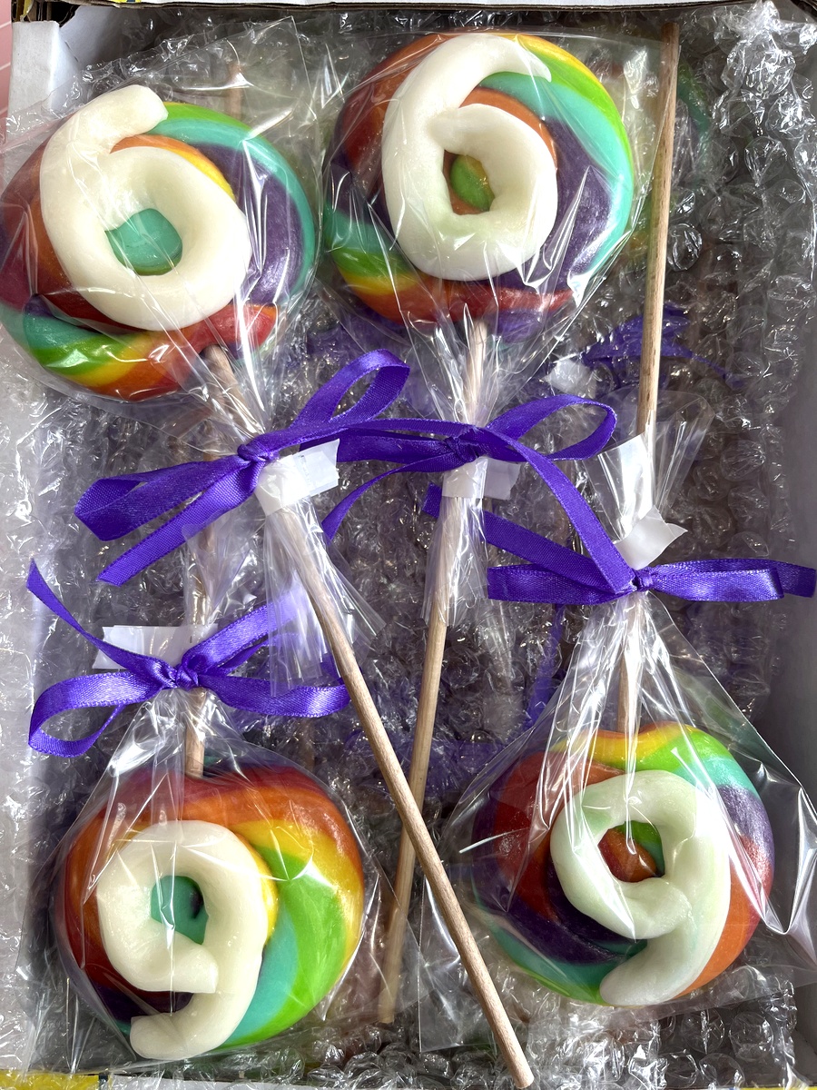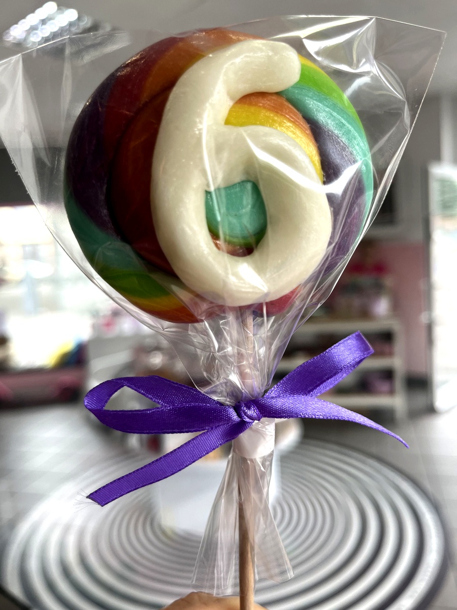 Lizak okrągły w tęczowych kolorach z białą cyfrą 6 (lub 9 odwrócona) na wierzchu. Każdy lizak zapakowany jest w folię i zawiązany fioletową wstążką. Każdy lizak to unikalne dzieło sztuki cukierniczej, tworzone tradycyjnymi metodami rzemieślniczymi.