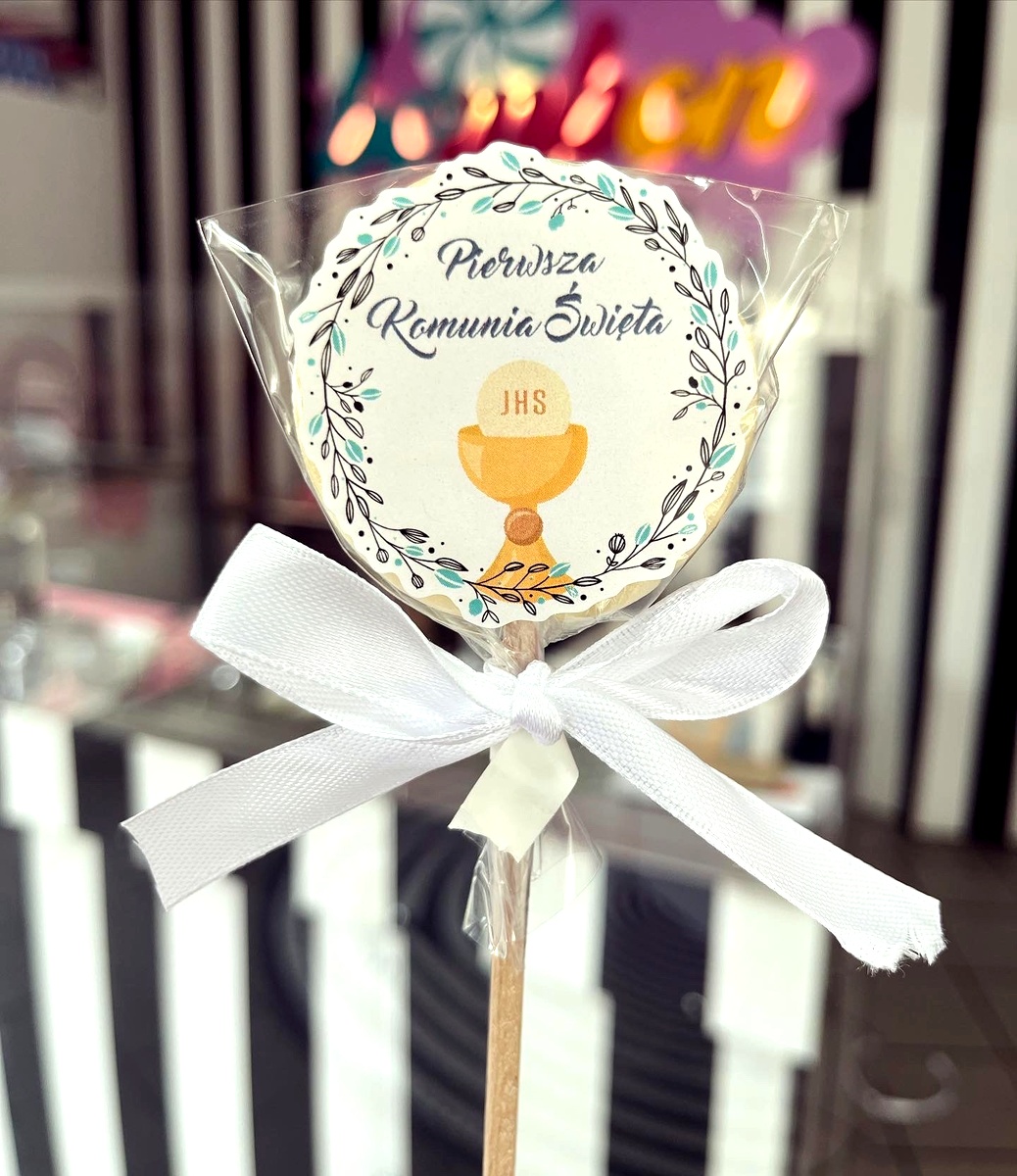 Lizak w kształcie koła z dekoracyjnym nadrukiem tematycznym, prawdopodobnie związanym z Pierwszą Komunią Świętą. Zapakowany w folię i ozdobiony białą kokardką. Każdy lizak to unikalne dzieło sztuki cukierniczej, tworzone tradycyjnymi metodami rzemieślniczymi.