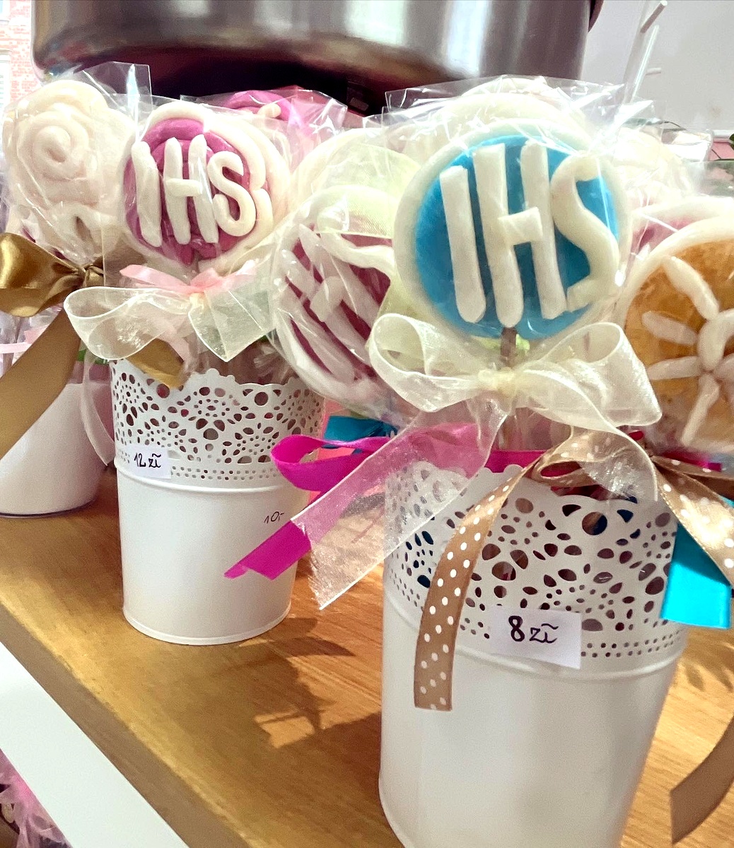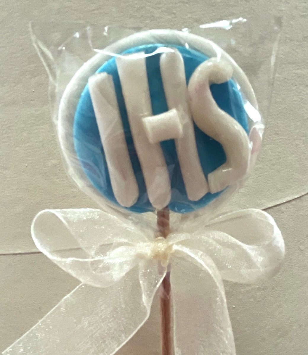 Lizak w kształcie okręgu z jasnoniebieskim tłem. Na środku znajdują się białe litery IHS. Każdy lizak to unikalne dzieło sztuki cukierniczej, tworzone tradycyjnymi metodami rzemieślniczymi.