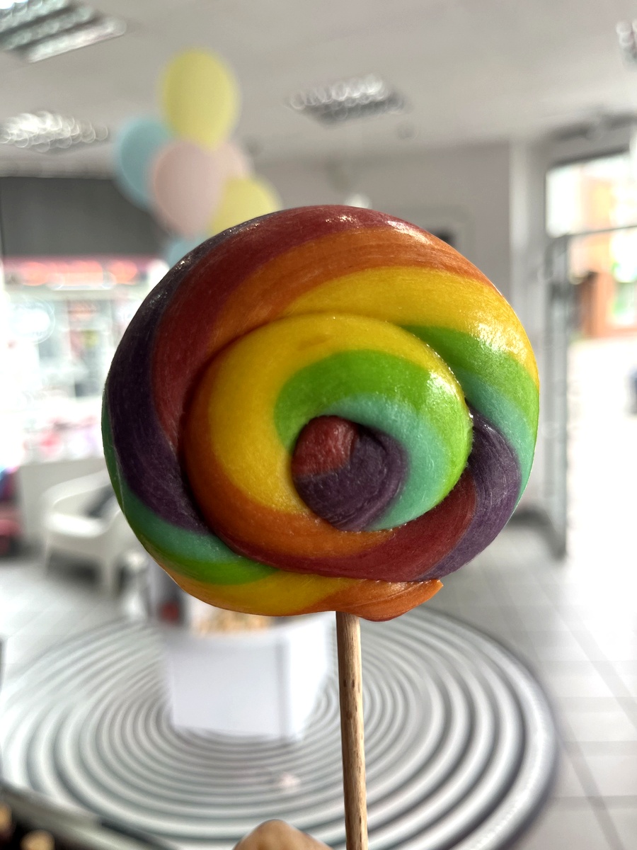 Lizak w kształcie spirali, w tęczowych kolorach. Dominuje żółty, pomarańczowy, fioletowy, zielony i czerwony. Każdy lizak to unikalne dzieło sztuki cukierniczej, tworzone tradycyjnymi metodami rzemieślniczymi.