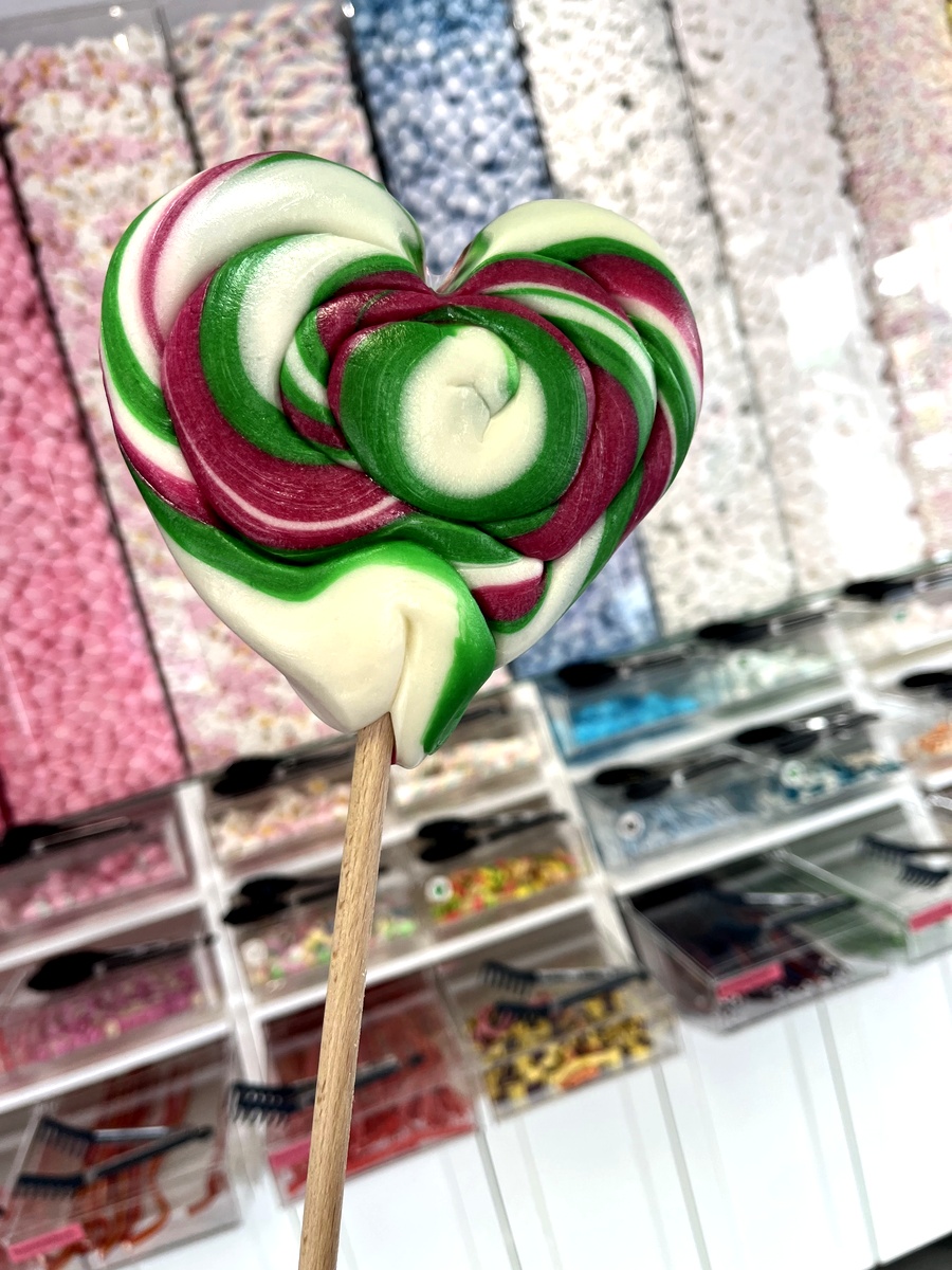Lizak w kształcie serca o spiralnym wzorze. Przeplatają się w nim kolory biały, zielony i czerwony. Każdy lizak to unikalne dzieło sztuki cukierniczej, tworzone tradycyjnymi metodami rzemieślniczymi.