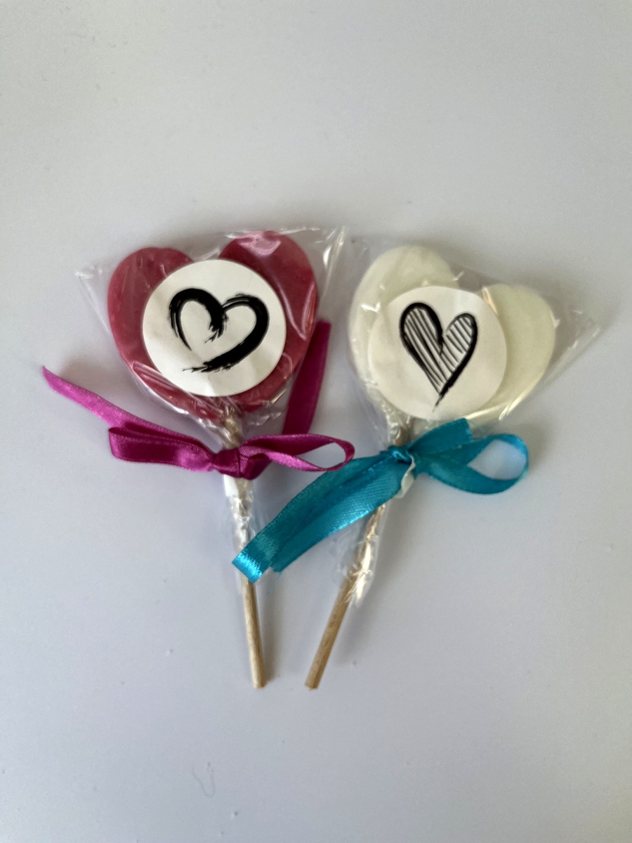 Dwa lizaki w kształcie serc, jeden czerwony, drugi biały. Obydwa posiadają na środku okrągłą naklejkę z rysunkiem serca oraz są przewiązane ozdobną wstążką. Każdy lizak to unikowe dzieło sztuki cukierniczej, tworzone tradycyjnymi metodami rzemieślniczymi.