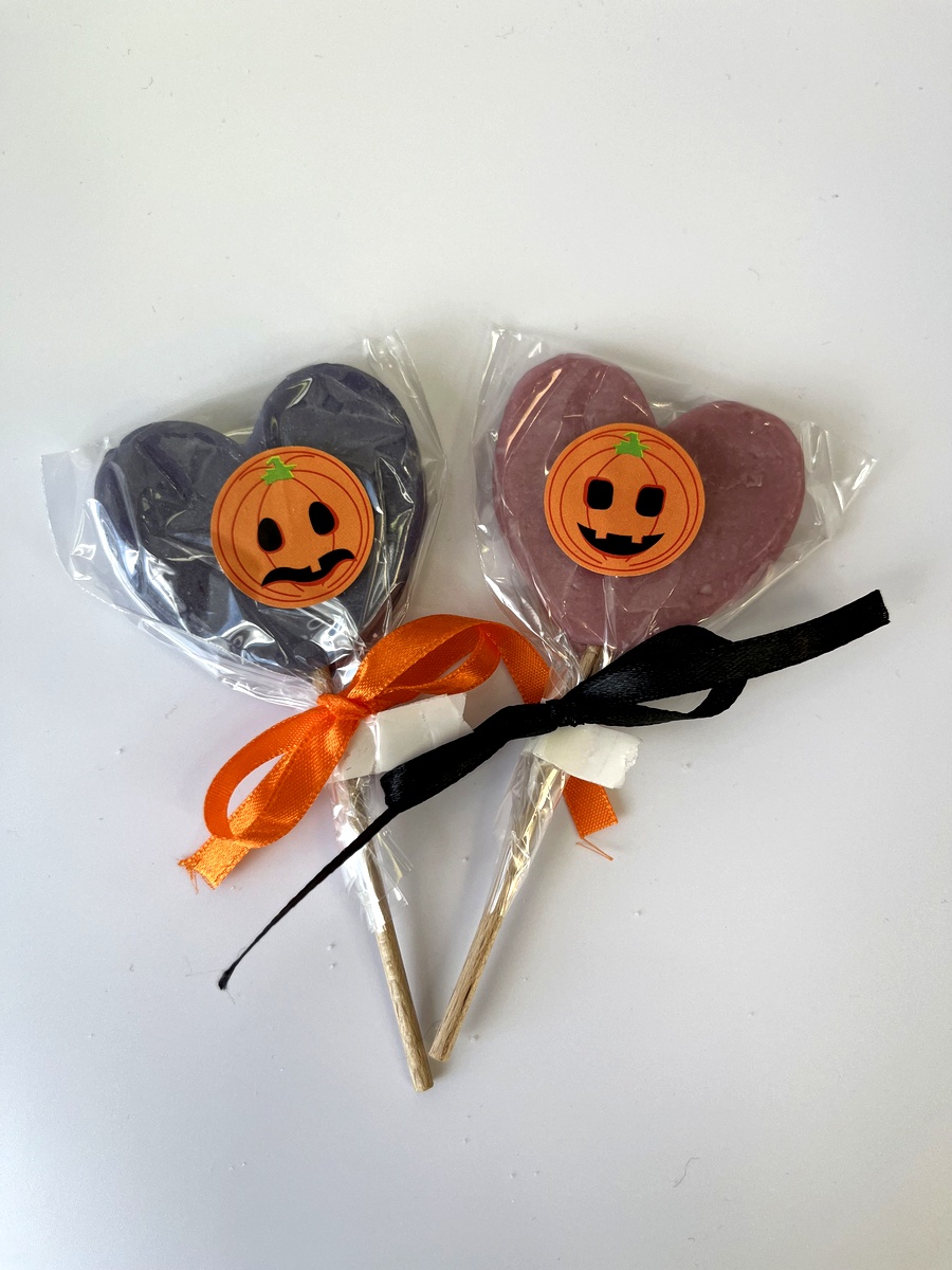 Dwa lizaki w kształcie serca, indywidualnie zapakowane w folię. Jeden jest ciemnofioletowy, a drugi jasnoróżowy, oba ozdobione naklejką z wesołą dynią Halloweenową. Każdy lizak to unikowe dzieło sztuki cukierniczej, tworzone tradycyjnymi metodami rzemieślniczymi.