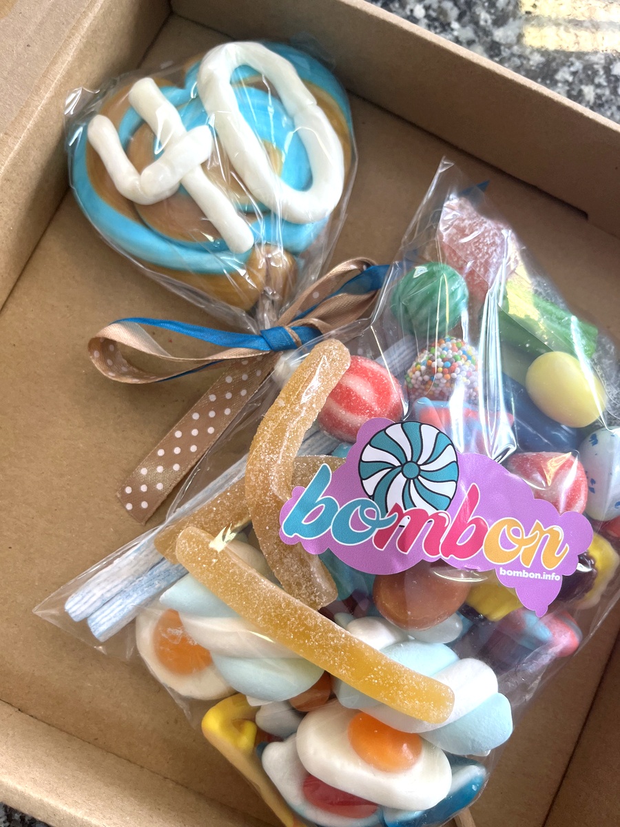 Lizak w kształcie serca z motywem spiralnym w odcieniach niebieskiego i brązowego. Na wierzchu umieszczona jest biała liczba ’40’. Każdy produkt to unikalne dzieło sztuki cukierniczej, tworzone tradycyjnymi metodami rzemieślniczymi.