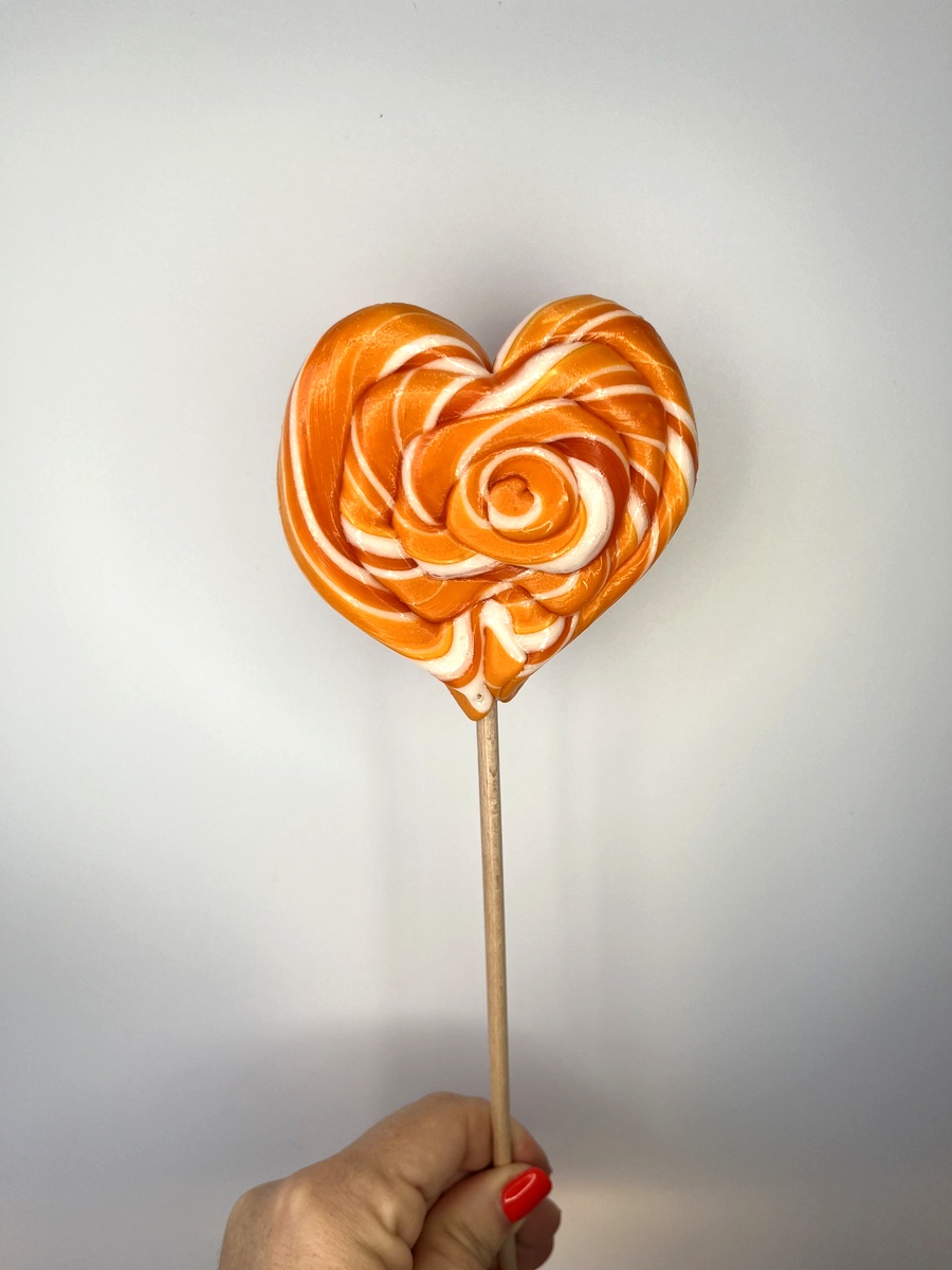 Lizak manufakturowy w kształcie serca, ozdobiony misternie zwiniętymi spiralnymi pasami w kolorze intensywnej pomarańczy i bieli, tworzącymi wzór przypominający rozkwitającą różę. Każdy lizak to unikowe dzieło sztuki cukierniczej, tworzone tradycyjnymi metodami rzemieślniczymi.