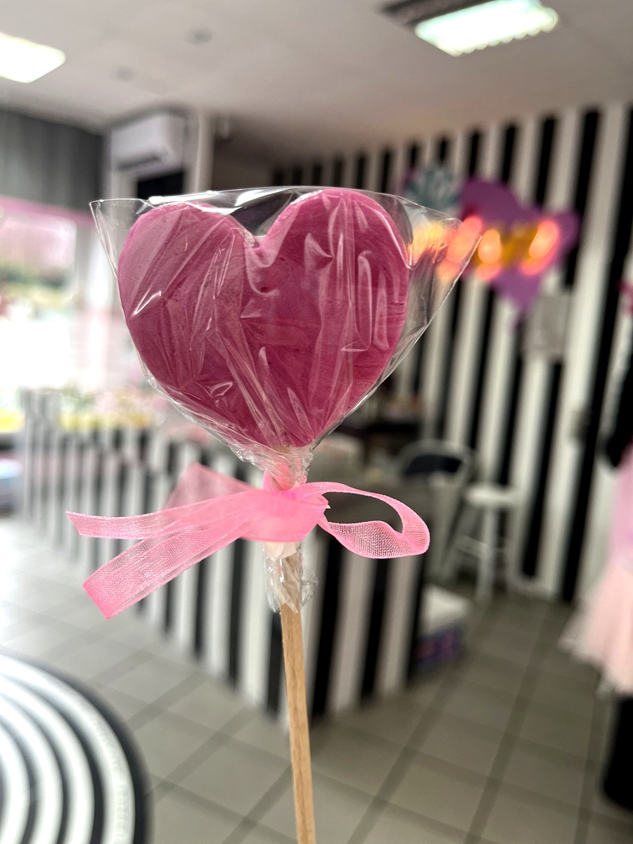 Lizak w kształcie serca, owinięty w przezroczysty celofan i zawiązany różową wstążką. Umieszczony jest na drewnianym patyku. Każdy lizak to unikalne dzieło sztuki cukierniczej, tworzone tradycyjnymi metodami rzemieślniczymi.