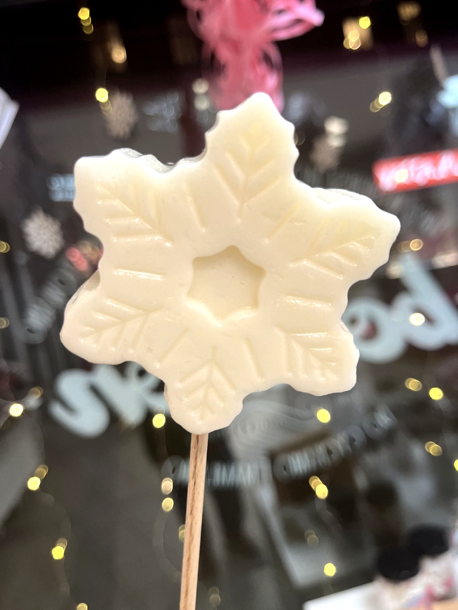Manufakturowy lizak w kształcie precyzyjnie wyrzeźbionej śnieżynki o delikatnym, kremowym odcieniu. Jego powierzchnia posiada misternie odwzorowane detale przypominające naturalne kryształki lodu. Każdy lizak to unikowe dzieło sztuki cukierniczej, tworzone tradycyjnymi metodami rzemieślniczymi.