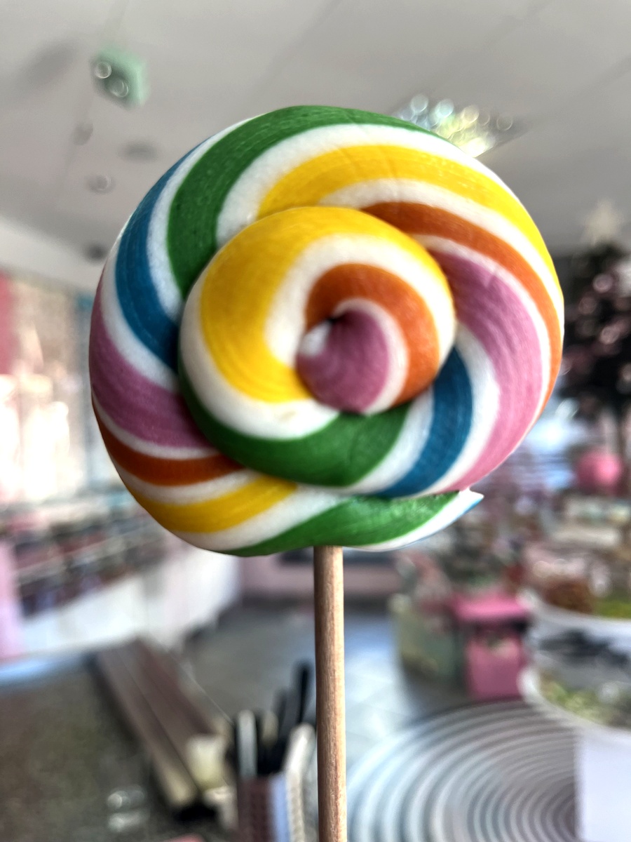 Duży, okrągły lizak o kształcie spirali, charakteryzujący się szerokimi, jaskrawymi pasami bieli przeplatającymi się z barwami tęczy, tworzącymi dynamiczny wzór. Każdy lizak to unikowe dzieło sztuki cukierniczej, tworzone tradycyjnymi metodami rzemieślniczymi.