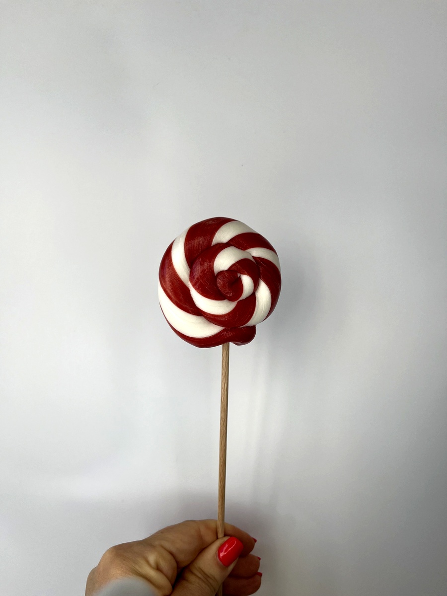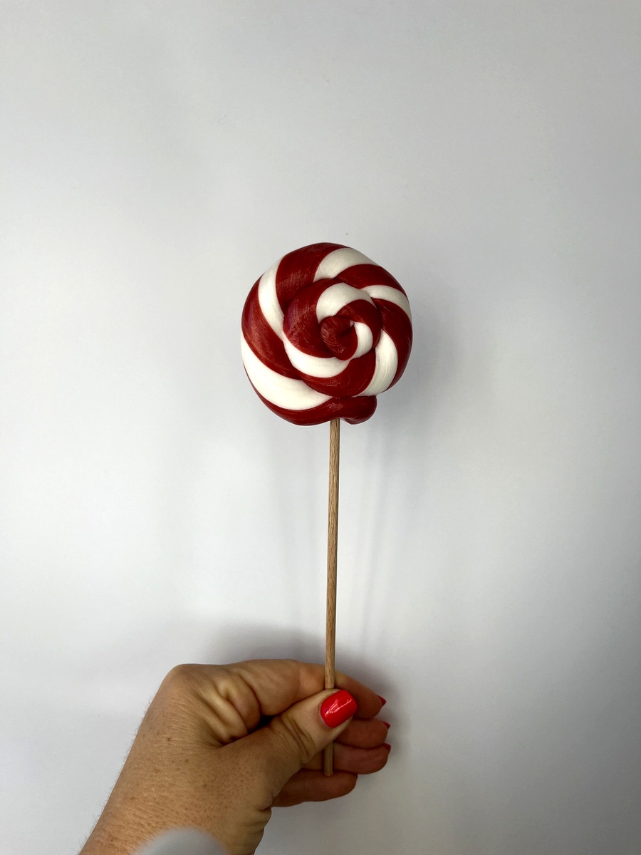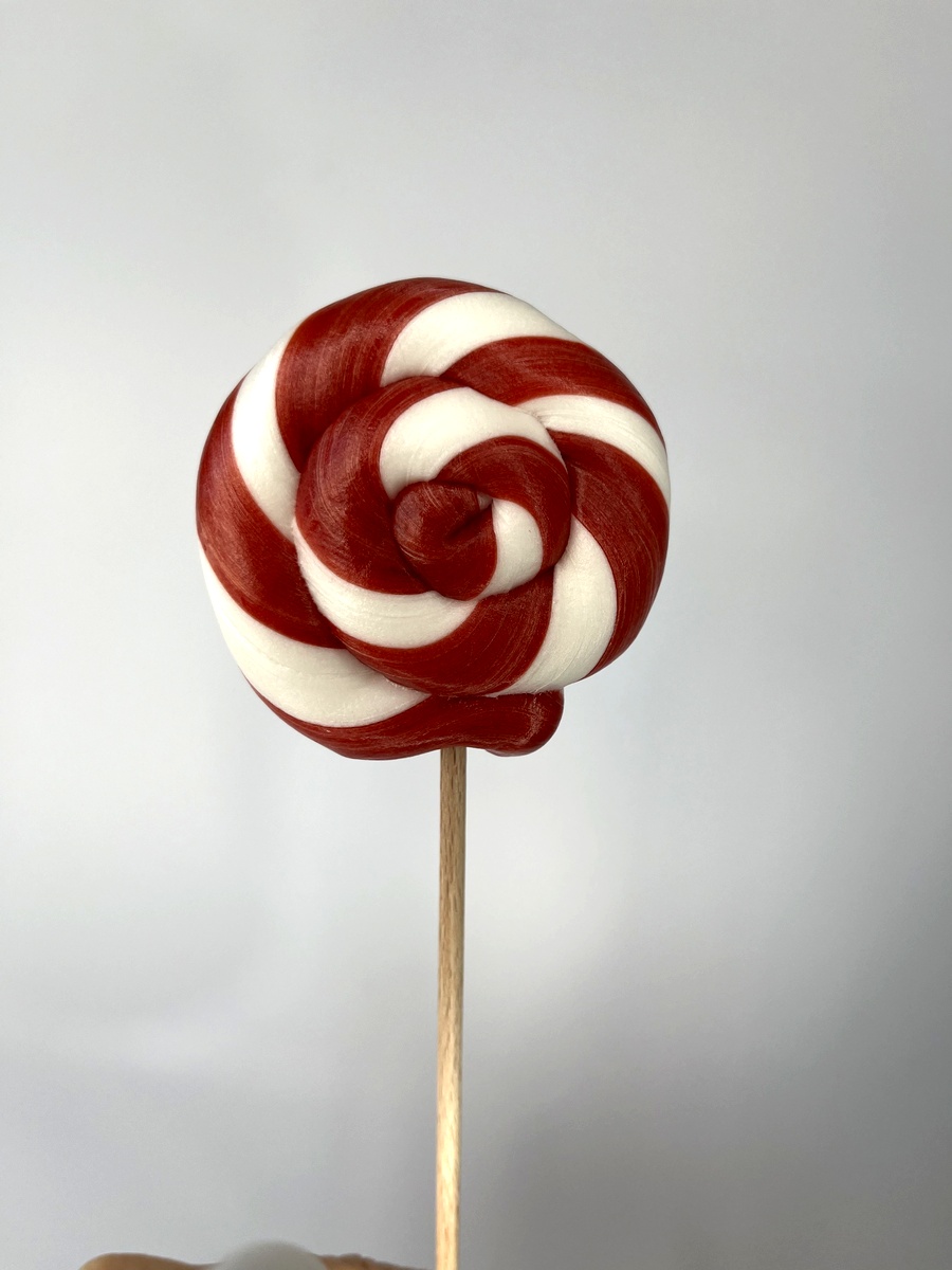 Klasyczny okrągły lizak z grubymi, czerwono-białymi pasami układającymi się spiralnie do środka. Osadzony jest na naturalnym, drewnianym patyku. Każdy lizak to unikowe dzieło sztuki cukierniczej, tworzone tradycyjnymi metodami rzemieślniczymi.