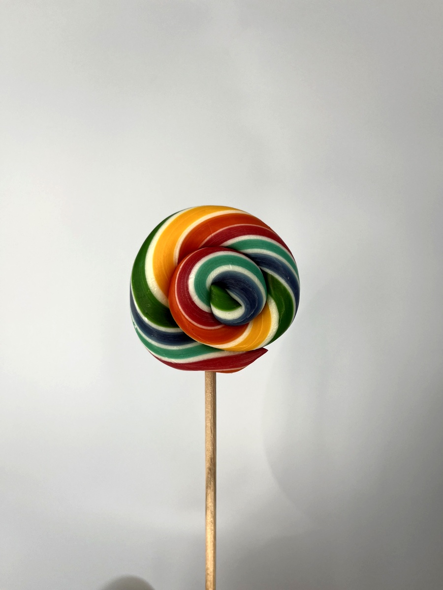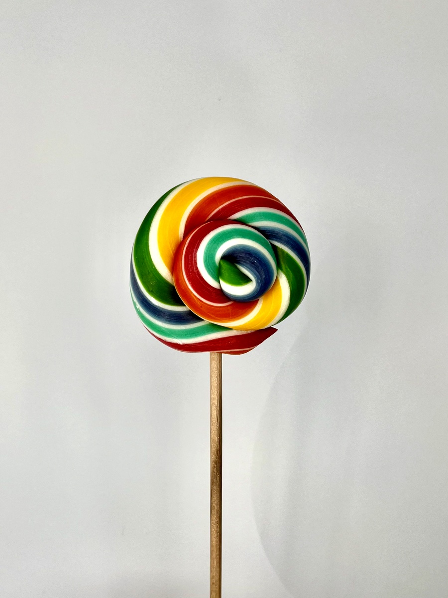 Lizak o płaskim, spiralnym kształcie, wykonany z wielu barwnych pasków. Prezentuje żywe kolory tęczy, przeplatające się z jasnymi, niemal białymi akcentami. Każdy lizak to unikowe dzieło sztuki cukierniczej, tworzone tradycyjnymi metodami rzemieślniczymi.