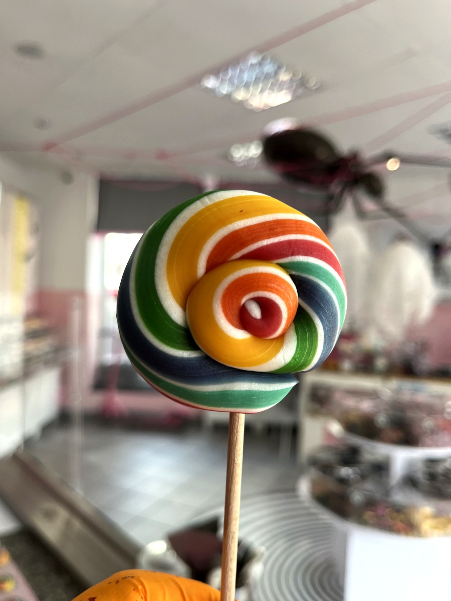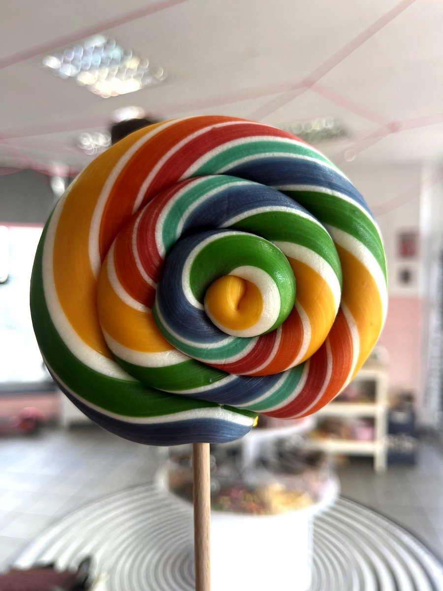 Lizak charakteryzuje się spiralnym ułożeniem szerokich, tęczowych pasów. Każdy kolorowy pas jest wyraźnie oddzielony od kolejnego cienką, białą linią. Każdy lizak to unikowe dzieło sztuki cukierniczej, tworzone tradycyjnymi metodami rzemieślniczymi.