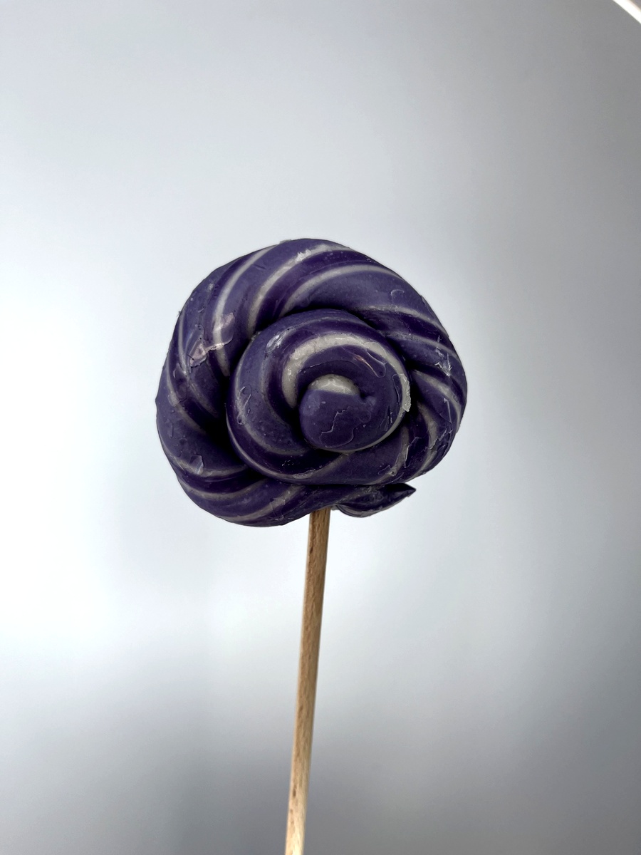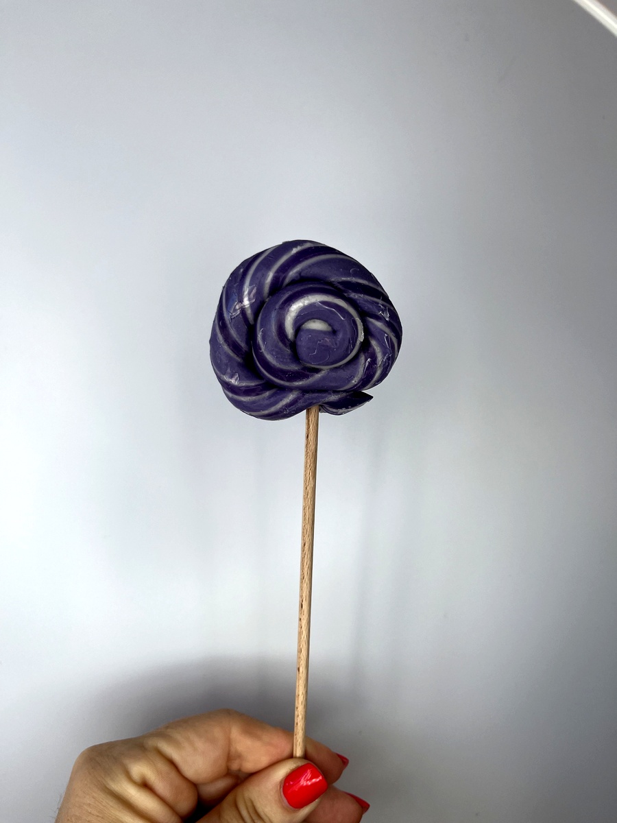 Manufakturowy lizak o wyraźnym spiralnym kształcie, wykonany z ciemnofioletowej masy z jaśniejszymi, białymi smugami. Jest osadzony na drewnianym patyczku. Każdy lizak to unikowe dzieło sztuki cukierniczej, tworzone tradycyjnymi metodami rzemieślniczymi.