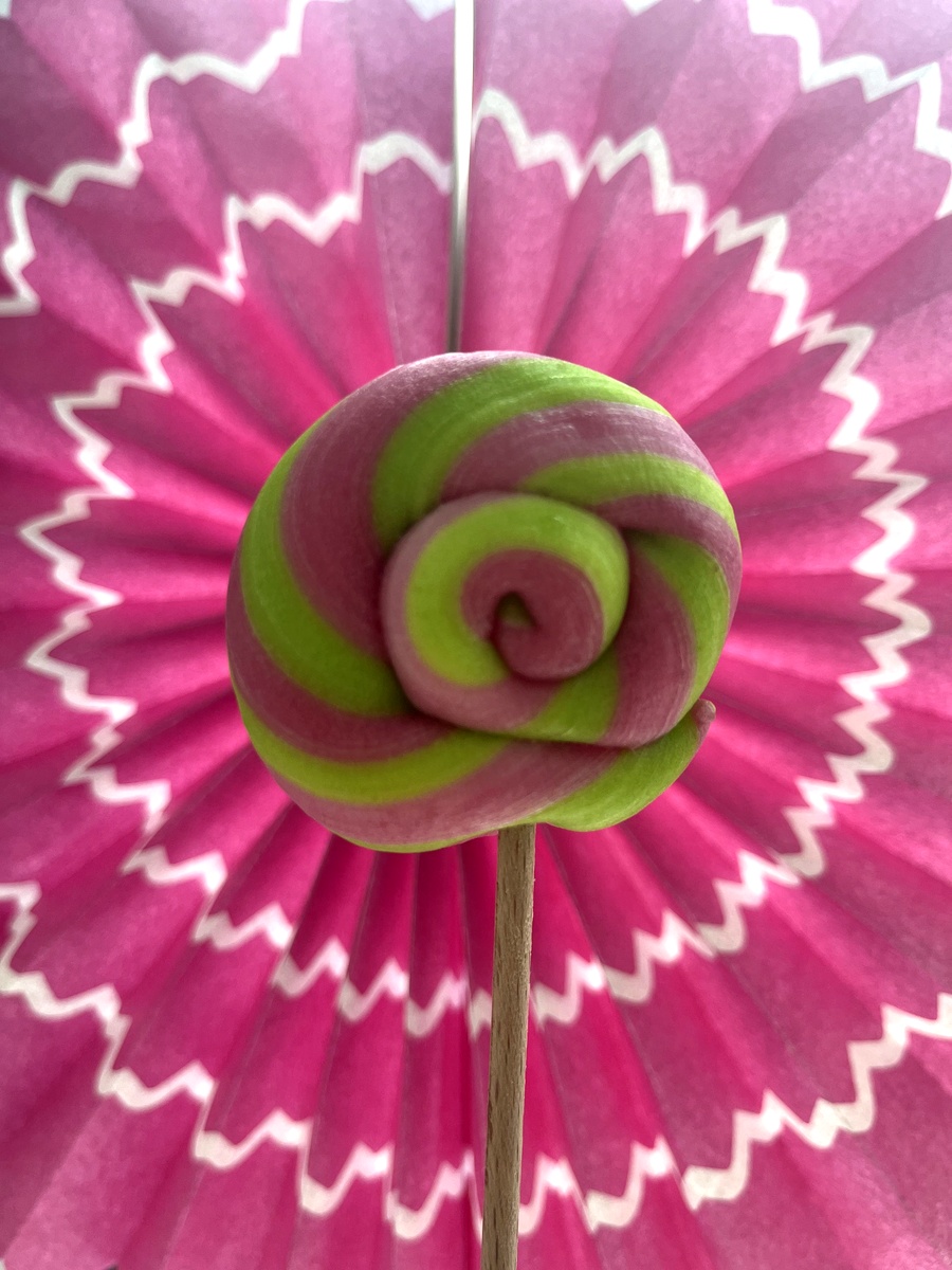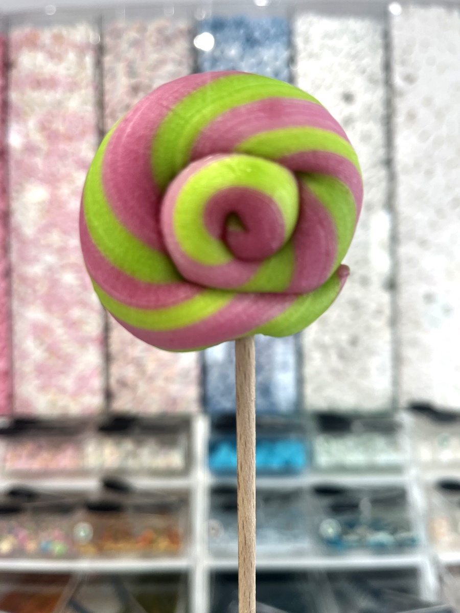 Lizak o płaskim, spiralnym kształcie, wykonany z dwóch intensywnych kolorów. Barwy fuksji i limonki przeplatają się, tworząc wesoły, cukierkowy wzór na drewnianym patyczku. Każdy lizak to unikowe dzieło sztuki cukierniczej, tworzone tradycyjnymi metodami rzemieślniczymi.