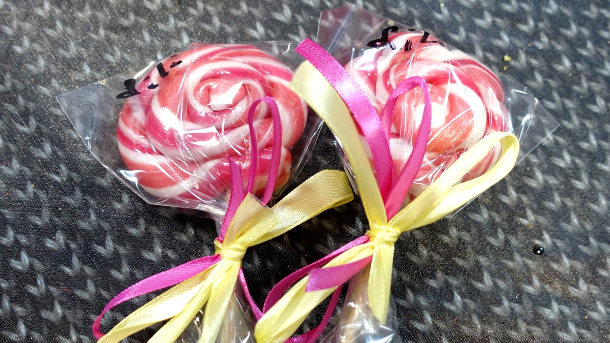 Okrągły lizak manufakturowy z klasycznym spiralnym wzorem w kolorach różowym i białym. Jest zapakowany w przezroczystą folię. Każdy lizak to unikowe dzieło sztuki cukierniczej, tworzone tradycyjnymi metodami rzemieślniczymi.