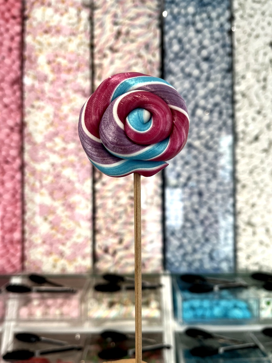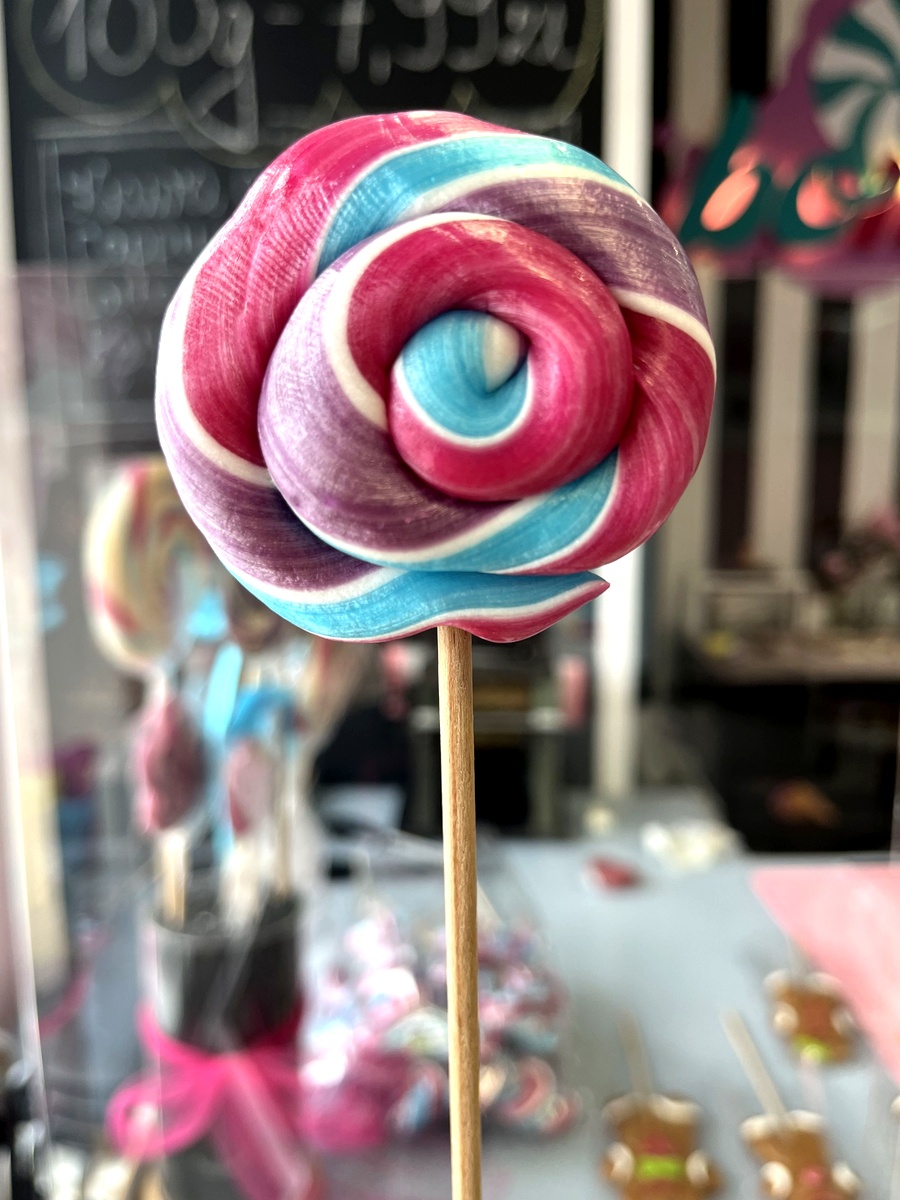Duży, rzemieślniczy lizak w kształcie spirali. Charakteryzuje się żywymi pasmami różu, błękitu i fioletu, które tworzą hipnotyzujący, wirujący wzór. Każdy lizak to unikowe dzieło sztuki cukierniczej, tworzone tradycyjnymi metodami rzemieślniczymi.