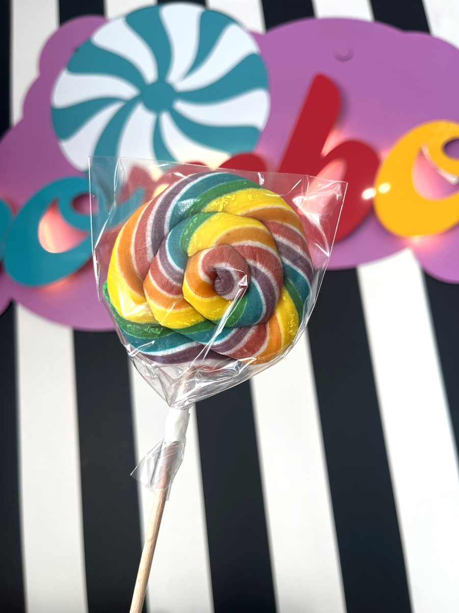 Duży, manufakturowy lizak o kształcie spiralnej rozety, wykonany z wielu jaskrawych, tęczowych pasów. Całość jest zapakowana w przezroczystą folię i osadzona na drewnianym patyczku. Każdy lizak to unikowe dzieło sztuki cukierniczej, tworzone tradycyjnymi metodami rzemieślniczymi.