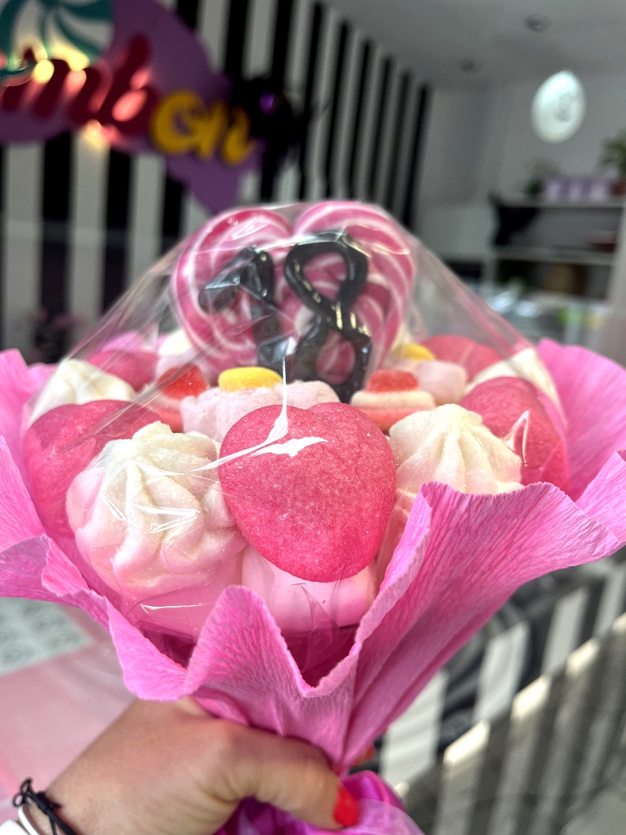 Bukiet słodkości złożony z lizaków w kształcie serc, pianek i żelków, opakowany w różowy papier. Na lizakach widnieje liczba 28. Każdy bukiet to unikalna kompozycja stworzona z ręcznie robionych lizaków i karmelków.