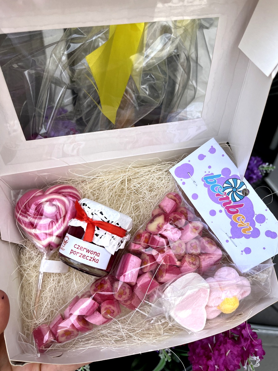 Różowy słodki upominek w pudełku, zawierający lizaka w kształcie serca, dżem z czerwonej porzeczki, cukierki i pianki. Całość zapakowana w estetyczny sposób.