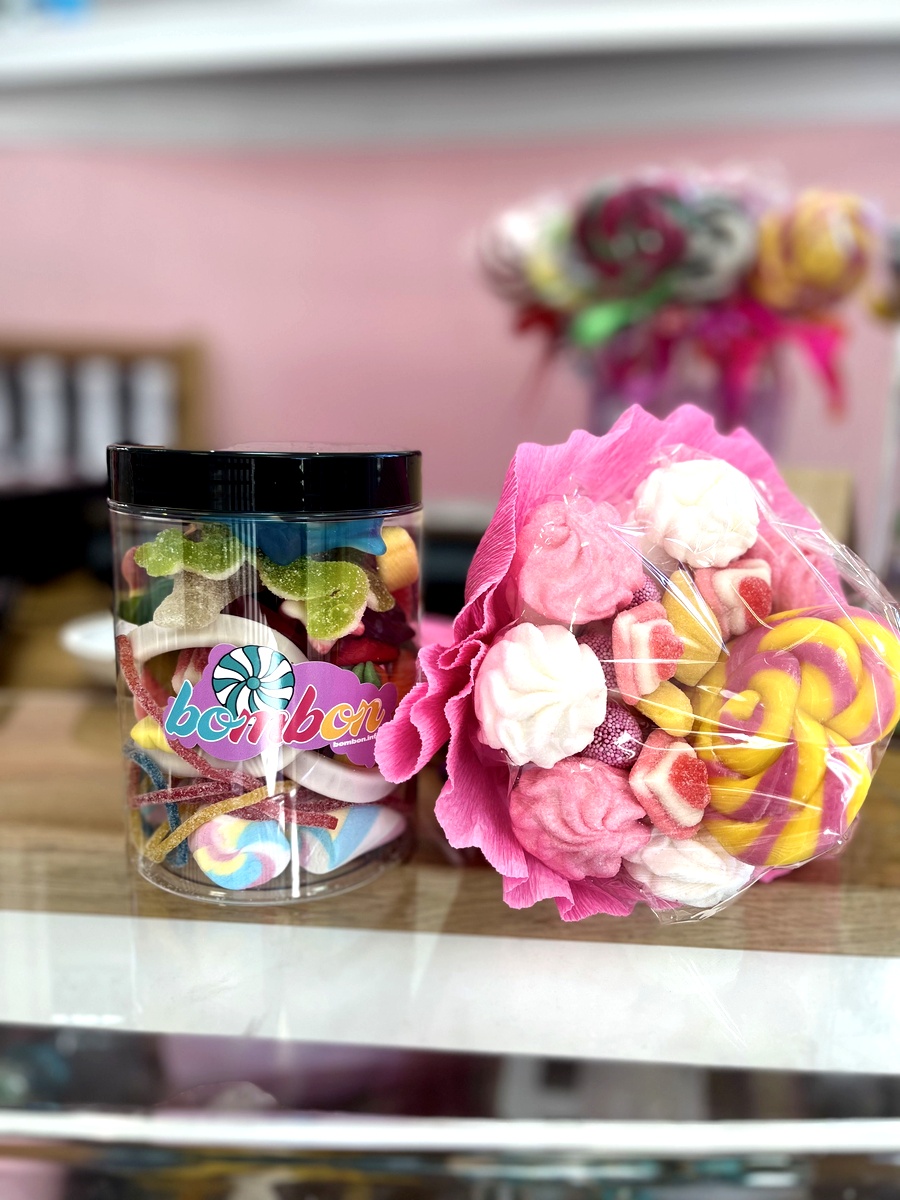 Zestaw składa się ze słoika wypełnionego różnymi słodyczami oraz bukietu ze słodkich pianek i lizaka, zapakowanego w różowy papier. Idealny prezent dla miłośników słodkości.