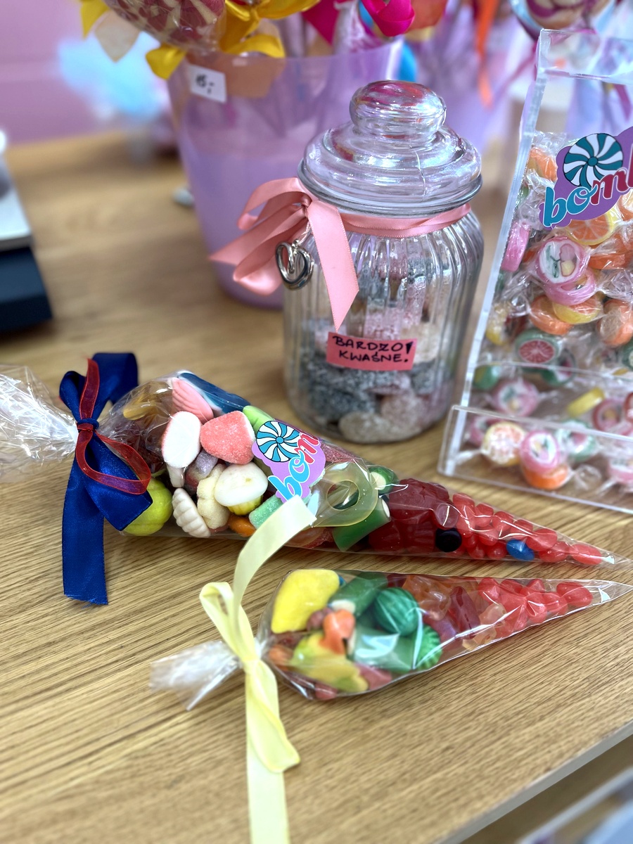 Różnorodne słodkości zapakowane w przezroczyste opakowania i ozdobione kolorowymi wstążkami. Widoczny słoik ze słodyczami 'bardzo kwaśnymi’ oraz torebki ze lizakami.